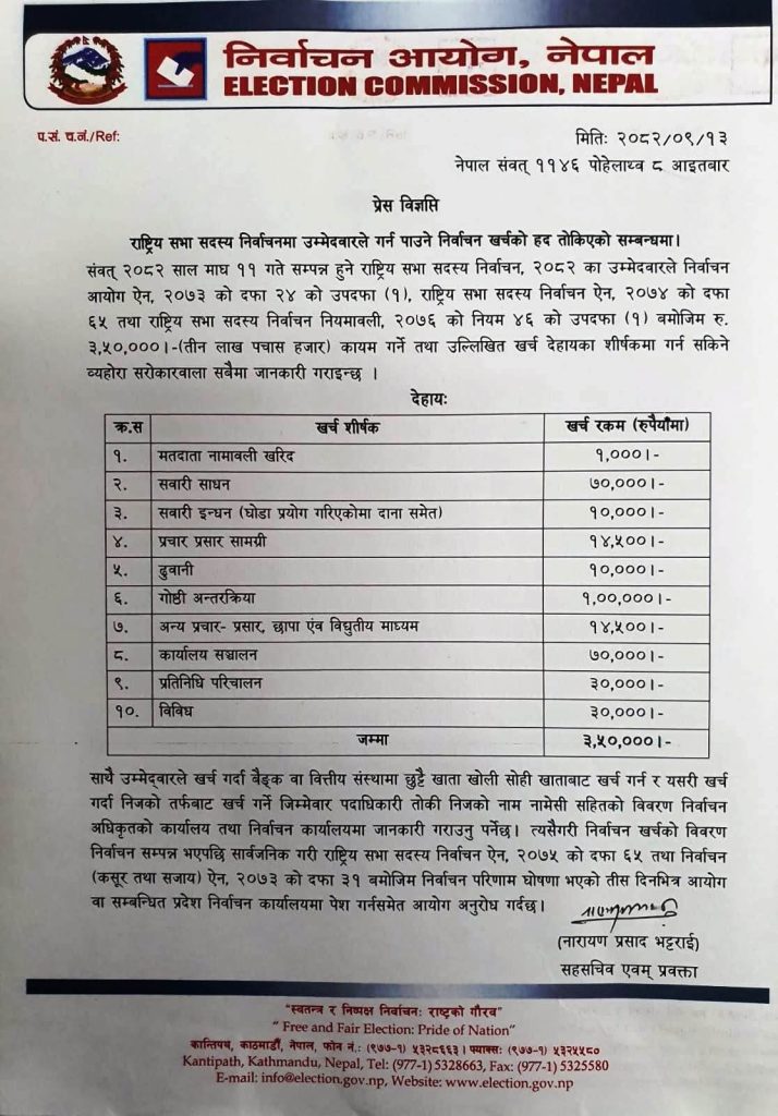 राष्ट्रिय सभा सदस्य निर्वाचनमा उम्मेदवारको खर्च सीमा निर्धारण