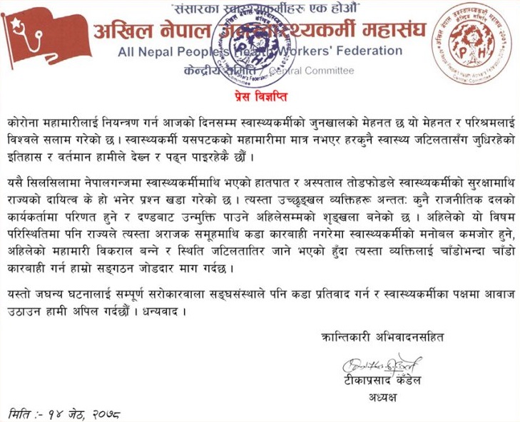 काठमाडौँ । अखिल (क्रान्तिकारी) केन्द्रीय समितिले भारतद्वारा अतिक्रमित भूमि लिपुलेक, नावी, कुटी, गुन्जी र कालापानी लगायतका क्षेत्रमा बसोबास गर्ने जनताहरूको जनगणना गर्नुपर्ने माग राख्दै बुधबार राजधानीको माईतीघर मण्डलामा दबावमुलक विरोध प्रदर्शन गरेको छ । उक्त विरोध प्रदर्शन कार्यक्रमलाई सम्बोधन गर्दै अखिल (क्रान्तिकारी) का केन्द्रीय अध्यक्ष प्रकाश शाहीले नेपालका राज्य सञ्चालकहरू आजको दिनमा आफ्नो सत्ता र […]