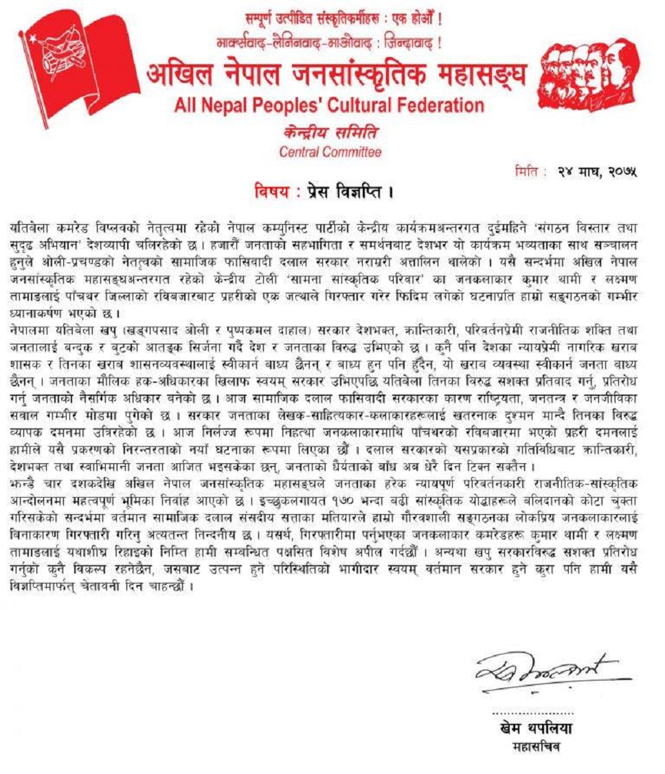 काठमाडौं, २१ चैत । नायिका रेखा थापाले समाचार बिकाउने नाममा राजनीतिक सङ्लग्नता, आस्था, सहयोग र समर्थनको फैसला गर्ने छुट कसैलाई नभएको बताएकी छन । उनले सरकारले प्रतिबन्ध लगाएको नेपाल कम्युनिष्ट पार्टी ‘विप्लव’ को बारेमा आफूले गरेको पवित्र ‘इरादा’ लाई बङ्याएर बुझ्ने गरेकोमा चरम असन्तुष्टि समेत व्यक्त गरेकी छन्। उनले बिहीबार बिहान फेशबुकमा स्टाटस राखेर मुलुकभित्रका […]