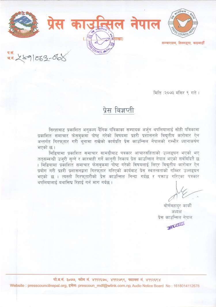 काठमाडाैँ, १७ माघ । एकीकृत जनक्रान्तिको मार्गमा अघि बढिरहेको नेकपा (माओवादी) ले भारतीय सेना सवार जहाजलाई काठमाडौंमा अवतरण गर्न नदिन माग गर्दै आफ्नो पार्टीले अप्रिय निर्णय लिन बाध्य नपार्न सरकारलाई चेतावनी दिएका छन् । सो पार्टीका जबस मोर्चा इन्चार्ज मोहन कार्की (जीवन्त) ले भने ‘हाम्रो पार्टीले एयरमार्सलविरुद्धको आन्दोलन देशव्यापी बनाउनेछ, तत्काल भारतीय सेना चढेको जहाजलाई […]