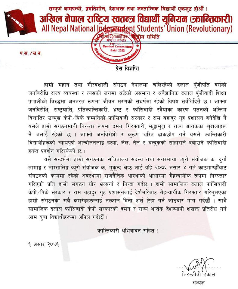 उनले विज्ञप्तिमा भनेका छन्, ‘हाम्रो महान् तथा गौरवशाली सङ्गठन नेपालमा चलिरहेको दलाल पुँजीपतिवर्गको जनविरोधी राज्य व्यवस्था र त्यसको जगमा अडेको असमान र अवैज्ञानिक दलाल पुँजीवादी शिक्षा प्रणालीकाविरुद्ध अनवरत रूपमा जीवन मरणको सङ्घर्षमा रहेको विषय सर्वविदितै छ । आफ्ना जनविरोधी, राष्ट्रघाती, प्रतिक्रान्तिकारी, भ्रष्ट र फासिवादी रबैयाका कारण पतनको अन्तिम दिशातिर उन्मुख केपी–पीके कम्पनीको फासिवादी सरकार र रामबहादुर गृह प्रशासन बनेदेखि नै यसले हाम्रो सङ्गठनमाथि निरन्तर रूपमा दमन, गिरफ्तारी, झूट्टामुद्दा र राज्य आतङ्कका शृङ्खलाहरू नै चलाइरहेको छ ।’