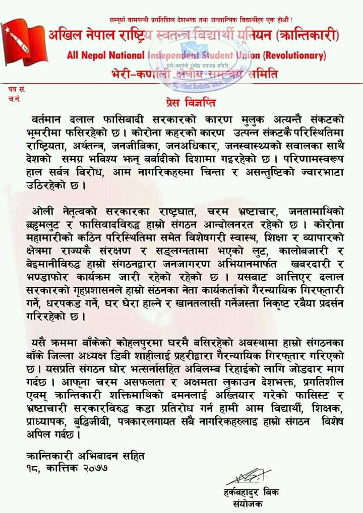 ओली नेतृत्वको सरकारका राष्ट्रघात, चरम भ्रष्टाचार, जनतामाथिको ब्रह्मलुट र फासिवादविरुद्ध हाम्रो संगठन आन्दोलनरत रहेको छ । कोरोना महामारीको कठिन परिस्थितिमा समेत विशेषगरी स्वास्थ, शिक्षा र व्यापारको क्षेत्रमा राज्यकै संरक्षण र सङ्लग्नतामा भएको लुट, कालोबजारी र बेइमानीविरुद्ध हाम्रो संगठनद्वारा जनजागरण अभियानमार्फत खबरदारी र भण्डाफोर कार्यक्रम जारी रहेको रहेको छ । यसबाट आत्तिएर दलाल सरकारको गृहप्रशासनले हाम्रो संठनका नेता कार्यकर्ताको गैरन्यायिक गिरफूतारी गर्ने, धरपकड गर्ने, घर घेरा हाल्ने र खानतलासी गर्नेजस्ता निकृष्ट रबैया प्रदशन गरिरहेको छ। यसै क्रममा बाँकेको कोहलपुरमा घरमै बसिरहेको अवस्थामा हाम्रो संगठनका बाँके जिल्ला अध्यक्ष डिबी शाहीलाई प्रहरीद्वारा गैरन्यायिक गिरफतार गरिएको छ। यसप्रति संगठन घोर भत्सर्नासहित अबिलम्ब रिहाईको लागि जोडदार माग गर्दछ । आफूना चरम असफलता र अक्षमता लुकाउन देशभक्त, प्रगतिशील एव क्रान्तिकारी शक्तिमाथिको दमनलाई अख्तियार गरेको फासिस्ट र भ्रष्टाचारी सरकारविरुद्ध कडा प्रतिरोध गर्न हामी आम विद्यार्थी, शिक्षक, प्राध्यापक, बृद्धिजीवी, पत्रकारलगायत सबै नागरिकहरुलाइ हाम्रो संगठन विशेष अपिल गर्दछ।