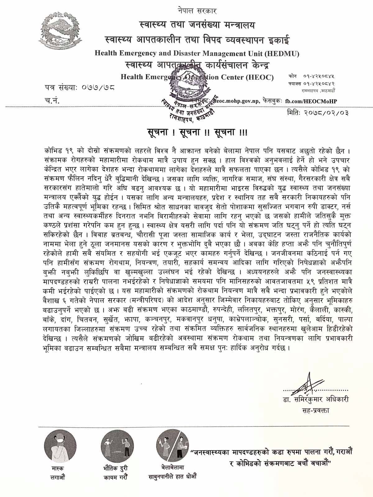 जनजीवनमा कठिनाई पर्न गए पनि हामीसंग संक्रमण रोकथाम, नियन्त्रण, तयारी, सहकार्य समन्वय आदिका लागि गरिएको निषेधज्ञाको अझै पनि बुझी नबुझी लुकीछिपि वा खुल्मखुल्ला उल्लङ्घन भइरहेको देखिन्छ उनले जारी गरेको सूचनामा भनिएको छ । यस्तै कोरोना भाइरस विरुद्धको लडाई मन्त्रालयको एक्लैको नभई सवैको भएको भन्दै यसको रोकथाम, उपचार र नियन्त्रणमा सवैको सहयोग हुनुपर्ने बताए ।