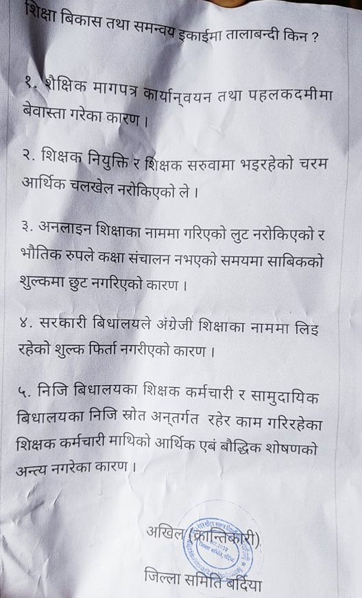 अखिल क्रान्तिकारी बर्दियाद्वारा शिक्षा विकास तथा समन्वय इकाईमा तालाबन्दी
