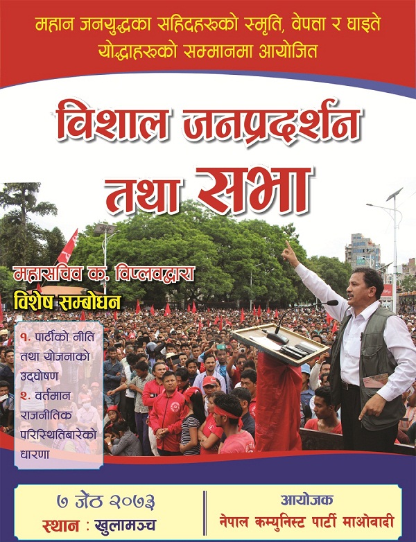 काठमाडौँँ । नेकपा माओवादीले यही शुक्रबार काठमाडौँँमा बिशाल जनप्रदर्शन तथा सभा गर्ने भएको छ । जनयुद्धका सहिदहरुको स्मृति, बेपता र घाईते योद्धाहरुको सम्मानमा आयोजित सभालाई नेकपा माओवादीका महासचिव नेत्रबिक्रम चन्द बिप्लब, प्रबक्ता प्रकाण्डलगायतका शीर्षस्थ नेताहरुले सम्बोधन गर्ने बताइएको छ । झन्डै एघार महिना यता कुनै सार्बजानिक कार्यक्रममा नदेखिएका माओवादीका महासचिब बिप्लबले सो सभालाई सम्बोधन गर्ने बताइएको छ । जनसभाका लागि माओवादीले कतिपय जिल्लाबाट युबा जनशक्ति काठमाडौँ ल्याउने तयारी समेत गरेको बुझिएको छ । पछिल्ला एक बर्षयता भुकम्प, नाकाबन्दी, संसदीय पार्टीहरुमा देखिएको भ्रष्ट र दलाली गतिबिधिलगायतका बिषयलाई लिएर गत चैत्रमा सम्पन्न केन्द्रिय समितिको बैठकको मूल मर्मलाई मध्यनजर गर्दै बिप्लबले सो सम्बोधन गर्न लागेको स्रोतले बताएको छ ।