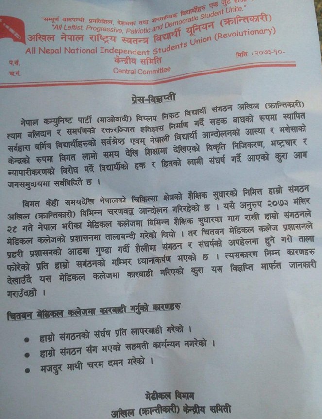 यस बिषयमा मेडिकल बिभाग, अखिल क्रान्तिकारी केन्द्रिय समितिले जारी गरेको प्रेस बिज्ञाप्ती यस प्रकार रहेको छ –