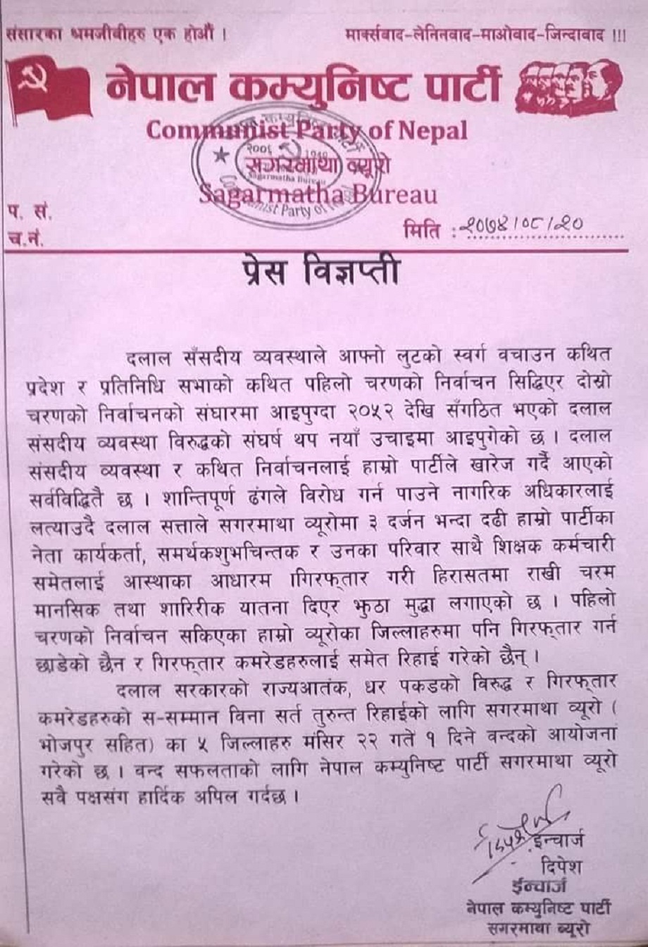 काठमाडौँ, २२ मंसिर । नेकपाले अाफ्नाे निर्दाेष नेताकार्यकर्ता रिहाइको मागगर्दै आज सगरमाथा ब्युराे बन्द गरेको छ । बन्दका कारण यातायातका , कलकारखाना, उद्योग, व्यापार व्यवसाय, शिक्षण संस्था सबै बन्द रहेका छन् । राज्यले दमनकारी रबैया तुरुन्त बन्द गरि गिरफ्तार परेका सबैको बिनासर्त रिहाइको माग गर्दै सगरमाथा ब्युराे बन्द गरेको नेकपा सगरमाथा ब्युराेले जनाएको छ।