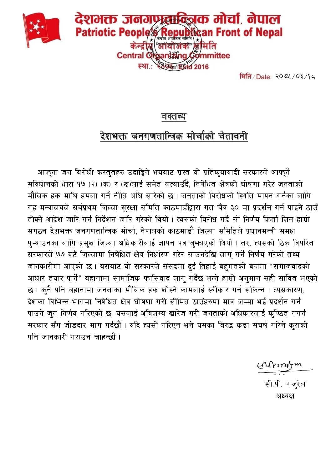 काठमाडौं, १८ असार । नेपाल कम्युनिष्ट पार्टी (क्रान्तिकारी माओवादी) समर्थित देशभक्त जनगणतान्त्रिक मोर्चा, नेपालका केन्द्रीय अध्यक्ष सीपी गजुरेलले काठमाडौं उपत्यका लगायत ७७ वटै जिल्लाका विभिन्न भागमा ओली सरकारले जारी गरेको निषेधाज्ञाको कडा विरोध गर्दै निषेधाज्ञा फिर्ता नगरिए त्यसका विरुद्ध कडा संघर्ष गर्ने चेतावानी दिएका छन् । गजुरेलद्वारा जारी वक्तव्यमा विरोध गर्न पाउने संविधान प्रदत्त जनताको मौलिक अधिकार खोस्ने गरी जारी गरिएको निषेधाज्ञाले समाजवादको आधार तयार पार्ने बहानामा ओली सरकारले सामाजिक फासिवाद लाद्न खोजेको मोर्चाको पूर्वानुमान सावित गराएको ठोकुवा गरिएको छ । गजुरेलद्वारा जारी वक्तव्यमा भनिएको छ, “आफ्ना जनविरोधी करतुतहरु उदाङ्गिने भयबाट ग्रस्त यो प्रतिकृयावादी सरकारले आफ्नै संविधानको धारा १७ (२) (क) र (ख)लाई समेत लत्याउँदै, निषेधित क्षेत्रको घोषणा गरेर जनताको मौलिक हक माथि हमला गर्ने नीति अघि सारेको छ । कुनै पनि बहानामा जनताका मौलिक हक खोस्ने कामलाई स्वीकार गर्न सकिन्न । त्यसकारण, देशका विभिन्न भागमा निषेधित क्षेत्र घोषणा गरी सीमित ठाउँहरुमा मात्र जम्मा भई प्रदर्शन गर्न पाउने जुन निर्णय गरिएको छ, यसलाई अविलम्ब खारेज गरी जनताको अधिकारलाई कुण्ठित नगर्न सरकार सँग जोडदार माग गर्दछौंं । यदि त्यसो गरिएन भने यसका बिरुद्ध कडा संघर्ष गरिने कुराको पनि जानकारी गराउन चाहन्छौं ।”