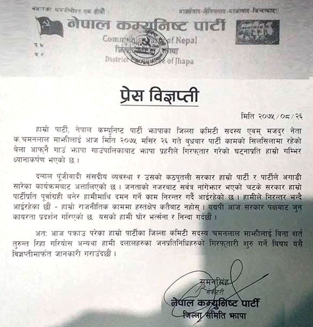 नेकपाको जनपक्षीय कार्यक्रम देखेर सरकार अत्तालिएको र बदलामा नेकपाका नेता कार्यकर्तामाथि राजनीतिक कार्यक्रम चलाइरहेका बेला समेत दमन र हस्तक्षेप गरी नेता माझीलाई झापा गाउँपालिकाबाट आज दिउँसो गिरफ्तार गरेको उल्लेख गर्दै सरकारले कायरतापूर्ण हर्कत अपनाएको जनाएका छन् । सरकार जनताबाट कटेर नाङ्गेझार भएको समेत नेकपा झापाको निस्कर्ष छ । साथै गिरफ्तार नेता माझीलाई निसर्तरुपमा तत्काल रिहा नगरेमा जनप्रतिनिधिलाई गिरफ्तार गर्ने चेतावनी विज्ञप्तिमा सेक्रेटरी सुमनले दिएका छन् । ‘आज पक्राउ परेका हाम्रो पार्टीका जिल्ला कमिटी सदस्य चमनलाल माझीलाई बिनासर्त तुरुन्त रिहा गरियोस्’ विज्ञप्तिमा भनिएको छ ‘अन्यथा, हामी दलालहरुका जाप्रतिनिधिहरुको पनि गिरफ्तारी शुरु गर्ने विषय यसै विज्ञप्तिमार्फत जानकारी गराउँदछौं ।’ आफ्ना नेता कार्यकर्ताको गिरफ्तारीको विषयलाई लिएर नेकपाले जनप्रतिनिधिलाई गिरफ्तार गरेर बदला लिने चेतावनी लिखितरुपमा दिएको सम्भवतः यो नै पहिलो हो ।