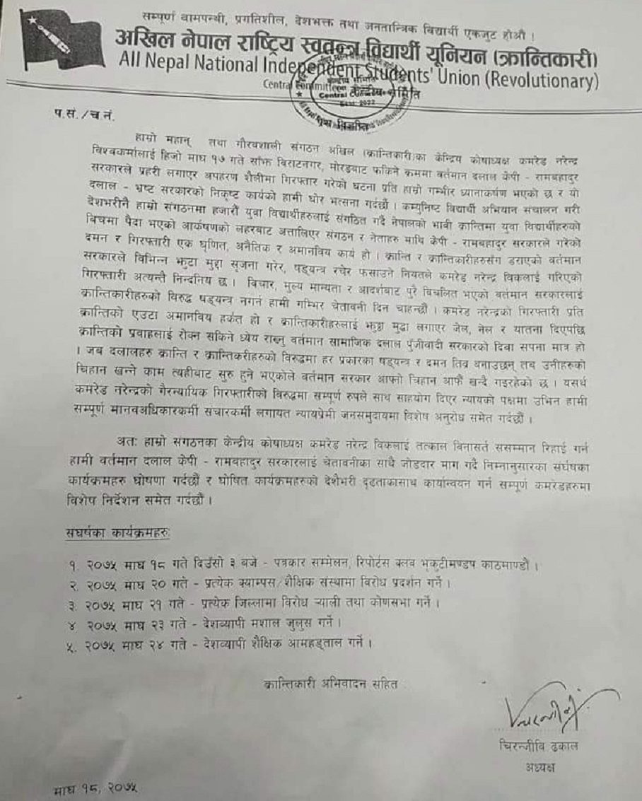 काठमाडौं, १८ माघ । नेपाल कम्युनिस्ट पार्टी निकट अखिल क्रान्तिकारीले चरणबद्ध आन्दोलनको घोषणा गरेको छ । अखिल क्रान्तिकारीका केन्द्रीय कोषाध्यक्ष नरेन्द्र विक गिरफ्तारीको बिषयलाई लिएर क्रान्तिकारीले आन्दोलनका कार्यक्रम चरणबद्ध घोषणा गरेको हो । अखिल क्रान्तिकारीले आज रिर्पोटस क्लवमा पत्रकार सम्मेलन गरी आन्दोलनका कार्यक्रमको घोषणा गरेको हो ।