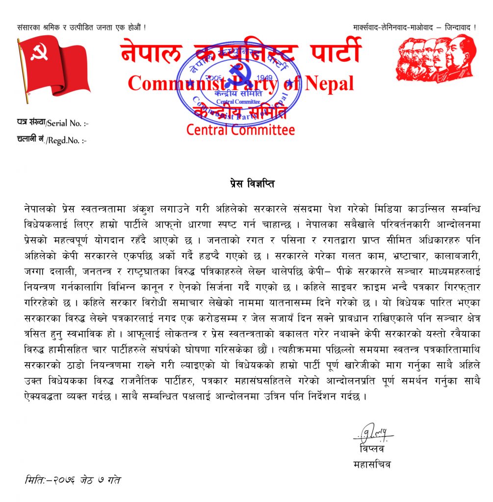 महासचिव विप्लवले विज्ञप्तिमा भनेका छन्, ‘नेपालको प्रेस स्वतन्त्रतामा अङ्कुश लगाउने गरी अहिलेको सरकारले संसद्मा पेस गरेको मिडिया काउन्सिलसम्बन्धी विधेयकलाई लिएर हाम्रो पार्टी आफ्नो धारणा स्पष्ट गर्न चाहन्छ । नेपालका सबैखाले परिवर्तनकारी आन्दोलनमा प्रेसको महत्वपूर्ण योगदान रहँदै आएको छ । जनताको रगत–पसिना र रगतद्वारा प्राप्त सीमित अधिकारहरू पनि अहिलेको केपी सरकारले एकपछि अर्को गर्दै हडप्दै गएको छ । सरकारले गरेका गलत काम, भ्रष्टाचार, कालोबजारी, जग्गा दलाली, जनतन्त्र र राष्ट्रघातका विरुद्ध पत्रिकाहरूले लेख्न थालेपछि केपी—पीके सरकारले सञ्चारमाध्यमहरूलाई नियन्त्रण गर्नका लागि विभिन्न कानुन र ऐनको सिर्जना गर्दै गएको छ । कहिले साइबर क्राइम भन्दै पत्रकार गिरफ्तार गरिरहेको छ । कहिले सरकारविरोधी समाचार लेखेको नाममा यातनासम्म दिने गरेको छ । यो विधेयक पारित भएमा सरकारका विरुद्ध लेख्ने पत्रकारलाई नगद एक करोडसम्म र जेल सजायँ दिनसक्ने प्रावधान राखिएकाले पनि सञ्चार क्षेत्र त्रसित हुनु स्वाभाविक हो । आफूलाई लोकतन्त्र र प्रेस स्वतन्त्रताको वकालत गरेर नथाक्ने केपी सरकारको यस्तो रबैयाका विरुद्ध हामीसहित चार पार्टीहरूले सङ्घर्षको घोषणा गरिसकेका छौँ । त्यही क्रममा पछिल्लो समयमा स्वतन्त्र पत्रकारितामाथि सरकारको ठाडो नियन्त्रणमा राख्ने गरी ल्याइएको यो विधेयकको हाम्रो पार्टी पूर्ण खारेजीको माग गर्नुका साथै अहिले उक्त विधेयकका विरुद्ध राजनीतिक पार्टीहरू, पत्रकार महासङ्घसहितले गरेको आन्दोलनप्रति पूर्ण समर्थन गर्नुका साथै ऐक्यबद्धता व्यक्त गर्दछ । साथै सम्बन्धित पक्षलाई आन्दोलनमा उत्रिन पनि निर्देशन गर्दछ ।’