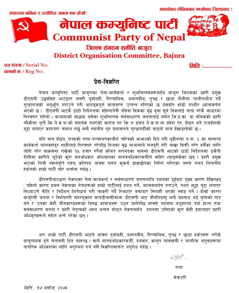 विज्ञप्तिमा लेखिएको छ, ‘डीएसपीभाटद्वारा नेकपाका नेता–कार्यकर्ता र सर्वसाधारण जनतामाथि दमनका दुईवटा मुख्य कारण देखिन्छन् : पहिलो कारण डबल नेकपाका नेताहरूको हाम्रो पार्टीलाई दमन गर्ने, आत्मसमर्पण गराउने, नभए झूट्टा मुद्दा लगाएर सिध्याउने नीति र निर्देशन शिरोधार्य गरी चाकरी गर्दै रिझाएर बफादार सिपाही भएको स्वाङ गर्ने । दोस्रो कारण बाजुरेली जनता र विशेषगरी सदरमुकाम मार्तडीबासीमाझ डीएसपी भाट यौनपिपासु भन्दै बदनाम भई घृणाको पात्र बने र उनका केही यौनकाण्डहरूका विरुद्ध आवाजहरू उठ्न थालेपछि आफ्नो बदनाम अनुहारमा पर्दा हाल्न तथा सर्वसाधारण जनता र प्रहरी नेतृत्वको ध्यान अन्यत्र मोड्न नेकपामाथि दमनमा उत्रिएको कुरा केही इमानदार प्रहरी अधिकृतहरूले समेत भन्ने गरेका छन् ।’