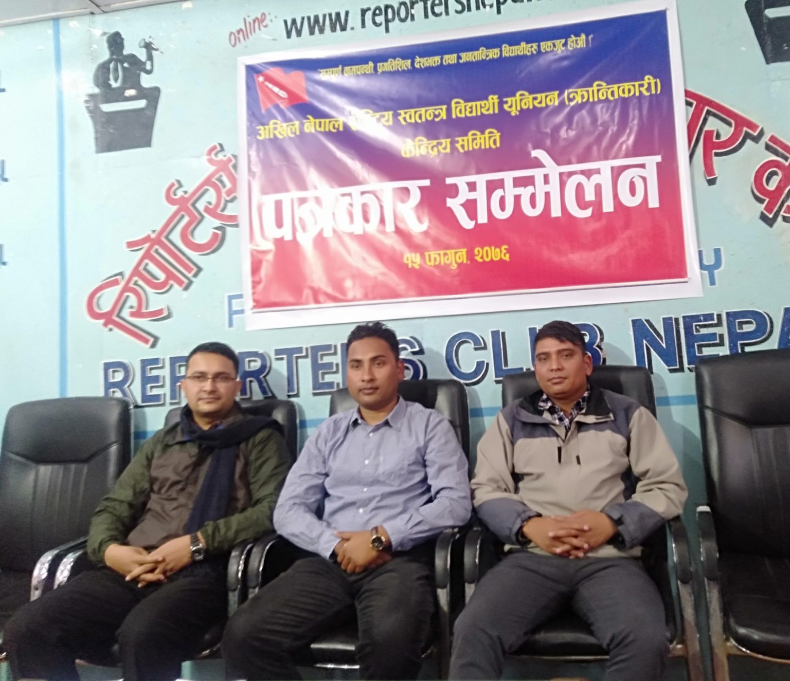 पत्रकार सम्मेलनपछि वितरित प्रेस विज्ञप्तिमा संगठनमाथिको प्रतिवन्ध तत्काल अन्त्य गरि शान्तिपूर्ण रुपमा स्ववियू निर्वाचनमा देशव्यापी रुपमा भाग लिने वातावरणको सृजना गर्न पनि माग गरिएको छ । यस्तै विगत केही समयदेखि चन्दा संकलन गरेको भन्ने भ्रामक र षड्यन्त्रमुलक समाचारहरु प्रति संगठनको गम्भिर ध्यानाकर्ष भएको पनि जनाईएको छ । विज्ञप्तिमा भनिएको छ, ‘हाम्रो संगठन यी समाचार र भ्रमहरुको खारेजी र खण्डन गर्दछ । हाम्रो संगठनको कोही कसैसँग चन्दा लिने नीति नभएको पनि स्पष्ट पार्न चाहन्छौं ।’