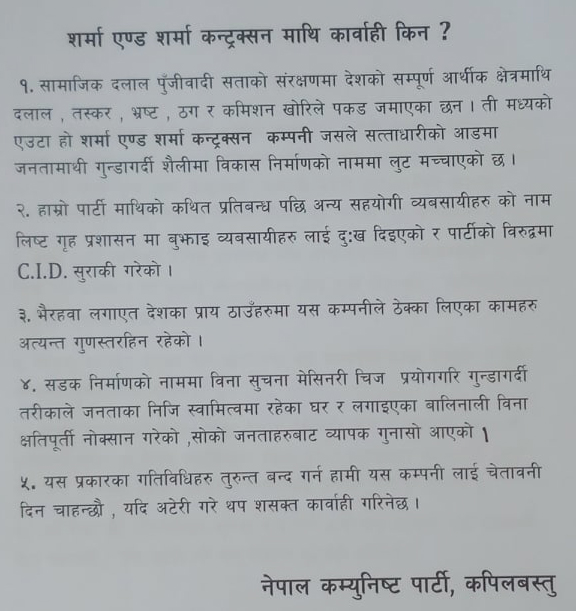 नेकपा कपिलवस्तुका नामबाट ‘शर्मा एन्ड शर्मा कन्स्ट्रक्सनमाथि कारबाही किन ?’ शीर्षकमा प्रकाशित पर्चामा नेकपाले आफ्नो पार्टीमाथि सरकारले प्रतिबन्ध लगाएको अवस्थामा अन्य सहगोगी व्यवसायीहरूको नामसूची गृहप्रशासनमा बुझाएर व्यवसायीहरूलाई दुःख दिने गरेको र आफ्नो पार्टीका विरुद्ध सुराकी गरेको उल्लेख गरेको छ ।