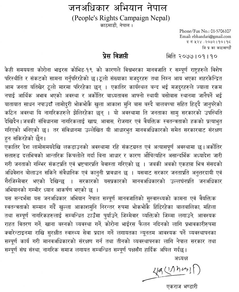 विज्ञप्तिमा भनिएको छ, ‘एकातिर देश लामो समयदेखि लकडाउनको अवस्थामा रही सङ्कटग्रस्त एवम् अत्यासपूर्ण अवस्थामा छ । अर्कोतिर सत्तारूढ दलभित्रको आन्तरिक किचलोले गर्दा बिनाआधार र कारण औचित्यहीन, असान्दर्भिक अध्यादेश जारी गरी जनताको गम्भीर सङ्कटप्रति एवम् भ्रष्टाचारप्रति बेवास्ता गरिएको छ जब कि अबको एक साताभित्र संसद्को अधिवेशन बोलाउन सकिने संवैधानिक एवम् कानुनी प्रावधान छ । यसबाट सरकार जनताप्रति अनुत्तरदायी एवम् गैरजिम्मेवार भएको देखिन्छ । सरकारको यसप्रकारको मानवअधिकारको उल्लङ्घनप्रति जनअधिकार अभियानको गम्भीर ध्यानाकर्षण भएको छ ।’