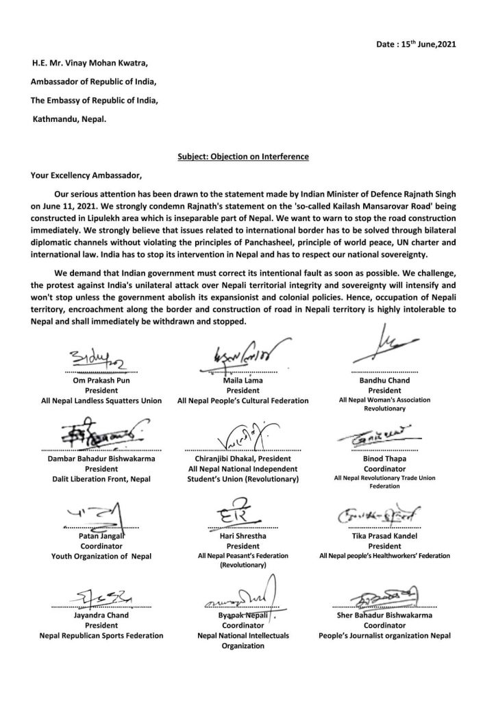नेपाल कम्युनिस्ट पार्टीको जनबर्गिय संगठनद्वारा नेपालस्थित भारतीय राजदुत बिनयमोहन क्वात्रालाई बुझाएको ज्ञापनपत्रमा भनिएको छ – ” भारतका रक्षामन्त्री राजनाथ सिंहले ११ जुन २०२१ मा दिएको वक्तव्यमा हाम्रो गम्भीर ध्यान आकर्षण भएको छ । नेपालको अभिन्न भाग रहेको लिपुलेख क्षेत्रमा निर्माण भइरहेको ‘ तथाकथित कैलाश मानसरोवर सडक ‘ सम्बन्धी राजनाथको भनाइको हामी कडा निन्दा गर्दछौ । हामी सडक निर्माण तत्काल रोक्न चेतावनी दिन चाहन्छौं । हामी विश्वस्त छौं कि अन्तर्राष्ट्रिय सीमा सम्बन्धी मुद्दाहरू द्विपक्षीय कूटनीतिक माध्यमहरू मार्फत पञ्चशीलका सिद्धान्तहरू , विश्वशान्तिको सिद्धान्त , संयुक्त राष्ट्र संघको बडापत्र र अन्तर्राष्ट्रिय कानूनको उल्लंघन नगरी समाधान गर्नुपर्दछ । भारतले नेपालमा आफ्नो हस्तक्षेप रोक्नु पर्दछ र हाम्रो राष्ट्रिय सार्वभौमिकताको सम्मान गर्नुपर्दछ । हामी माग गर्दछौं कि भारत सरकारले जानाजानी यस गल्तीलाई जतिसक्दो चाँडो सुधार गर्नुपर्दछ । हामी चुनौती दिन्छौं , नेपाली क्षेत्रीय अखण्डता र सार्वभौमिकतामाथि भारतको एकपक्षीय आक्रमणको विरोध तीव्र हुनेछ र सरकारले आफ्नो विस्तारवादी र औपनिवेशिक नीतिहरू समाप्त नगरेसम्म रोक्नेछ । तसर्थ नेपाली क्षेत्रको कब्जा , सीमा क्षेत्रमा अतिक्रमण र नेपाली क्षेत्रको सडक निर्माण असहनीय छ ।”