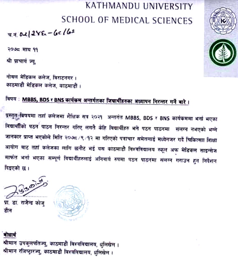 नेपाल कम्युनिस्ट पार्टीनिकट अखिल (क्रान्तिकारी) सहित सात विद्यार्थी सङ्गठन काठमाडौँँ र नोवेल मेडिकल कलेजको मेडिकल विद्यार्थीमाथिको लुट र ज्यादतिबिरुद्ध एकजुट भएर अगाडि बढेपछि सरकारलाई समेत विद्यार्थीको माग सुनुवाई गर्न बाध्यकारी बन्न पुग्यो र त्यसको लागि शिक्षा, विज्ञान तथा प्रविधिमन्त्री देवेन्द्र पौडेलले पहलकद्मी लिए । तर, शिक्षामन्त्रीलाई समेत चुनौती दिँदै मेडिकल माफिया सुनिल शर्मा आफ्नो अडानबाट पछि हटेनन् अन्ततः विद्यार्थीको आन्दोलनको बलमा सरकारले मेडिकल माफिया सुनिल शर्मालाई ठगी गरेको विषयमा पक्राउ गरी जेलमा कोच्ने तयारी गरेपछि उनी भागेर अमेरिका पुगेका छन् भने काठमाडौँँ विश्वविद्यालयले विद्यार्थीको मागबमोजिम काठमाडौँँ र नोबेल मेडिकल कलेजलाई कानुनको दायरामा ल्याउन अग्रसर भएको छ । काठमाडौँँ विश्वविद्यालयले काठमाडौँ र नोवेल मेडिकल कलेजलाई विद्यार्थीसँग अनियमित ढंगले असुलिएको रकम फिर्ता गर्नलगायत छात्राबासको विषयमा समेत कानुनबमोजिम कार्य गर्न र पठनपाठन सुचारु गर्न पत्राचार गरिसकेको नेपाल कम्युनिस्ट पार्टीनिकट अखिल (क्रान्तिकारी) का केन्द्रिय उपाध्यक्ष नरेन्द्र विश्वकर्माले बताए । उपाध्यक्ष विश्वकर्माले मेडिकल माफियालाई जुनसुकै मूल्यमा तह लगाएरै छोड्ने ठोकुवा गर्दै यसै साता शिक्षा मन्त्रालय, सम्बन्धित मेडिकल कलेज र आन्दोलनरत विद्यार्थीबीच लिखित सम्झौता गरेर आन्दोलनलाई सफल बनाउन सम्पूर्ण विद्यार्थी संगठन लागिपरेको जानकारी समेत दिए ।- क्षेप्यास्त्र साप्ताहिक