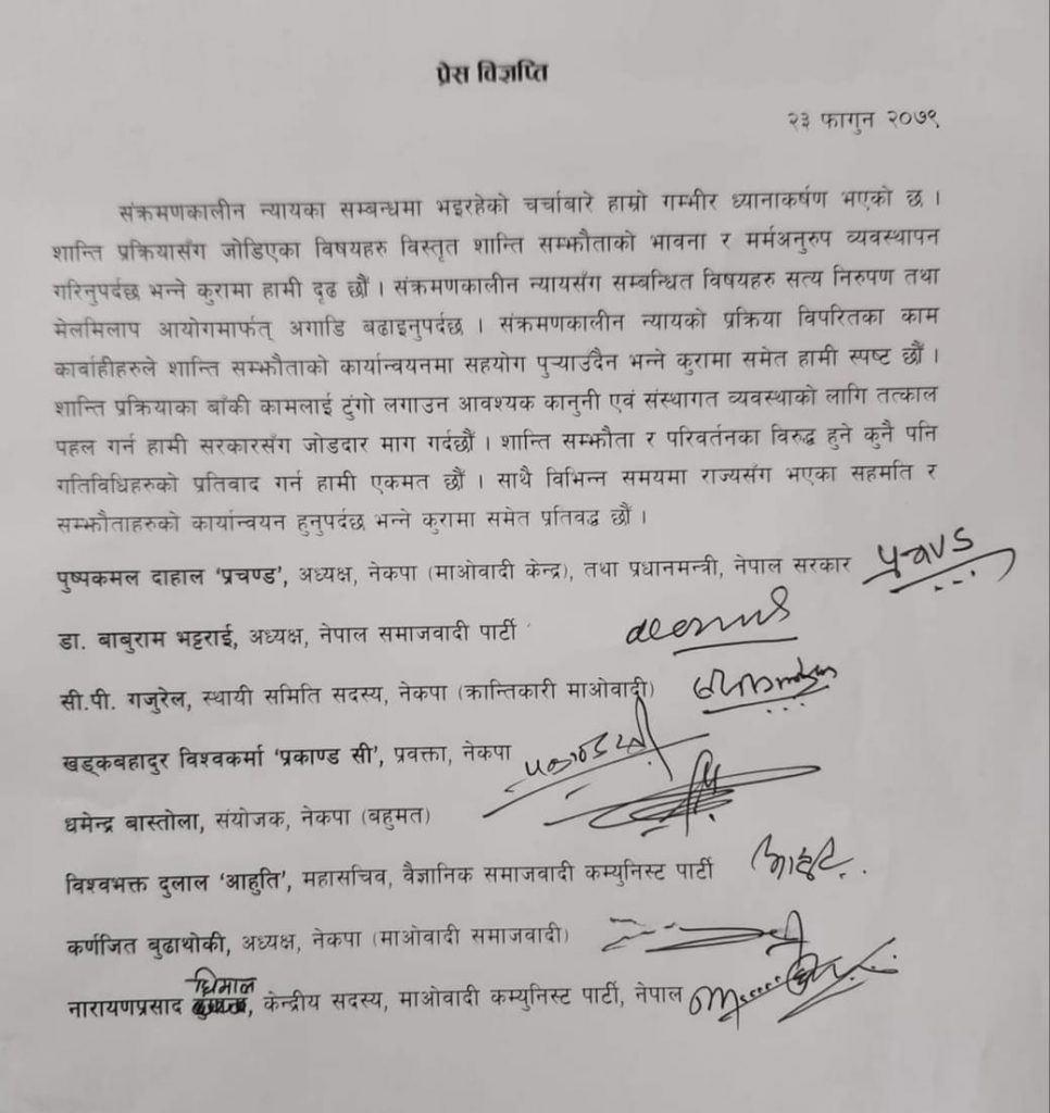 उक्त बैठकले शान्ति प्रक्रियाका बाँकी कामलाई टुंगो लगाउन आवश्यक कानुनी एवं संस्थागत व्यवस्थाका लागि तत्काल पहल गर्न सरकारसँग जोडदार माग गरेको छ भने शान्ति सम्झौता र परिवर्तनका विरुद्ध हुने कुनै पनि गतिविधिहरुको प्रतिवाद गर्न एकमत हुने निर्णय समेत गरेको छ ।