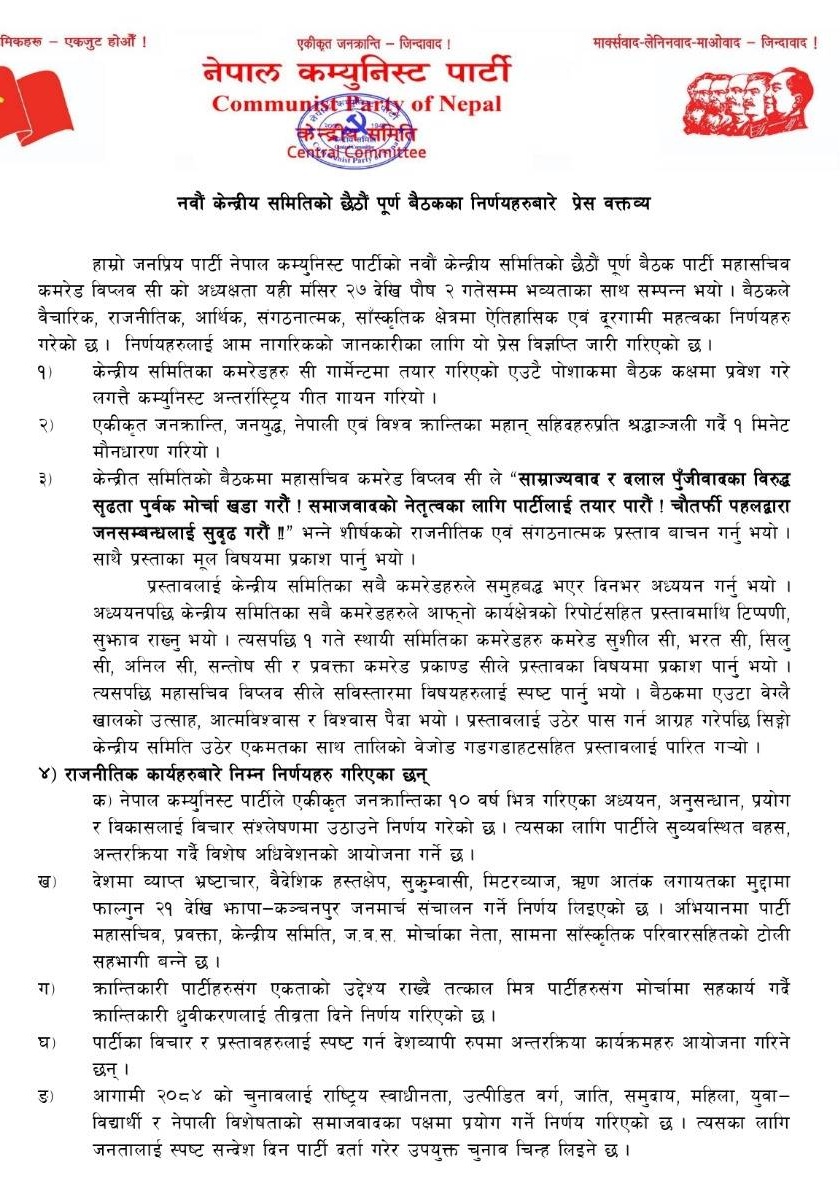 उक्त पत्रकार सम्मेलनमा प्रवक्ता प्रकाण्ड सीले नवौँ केन्द्रीय समितिको छैठौं पूर्ण बैठकले गरेका निर्णय वाचन गरेका थिए । जुन यस प्रकार रहेको छ -‘हाम्रो जनप्रिय पार्टी नेपाल कम्युनिस्ट पार्टीको नवौं केन्द्रीय समितिको छैठौं पूर्ण बैठक पार्टी महासचिव कमरेड विप्लव सी को अध्यक्षता यही मंसिर २७ देखि पौष २ गतेसम्म भव्यताका साथ सम्पन्न भयो । बैठकले बैचारिक, राजनीतिक, आर्थिक, संगठनात्मक, सांस्कृतिक क्षेत्रमा ऐतिहासिक एवं द्रगामी महत्वका निर्णयहरु गरेको छ । निर्णयहरुलाई आम नागरिकको जानकारीका लागि यो प्रेस विज्ञप्ति जारी गरिएको छ ।