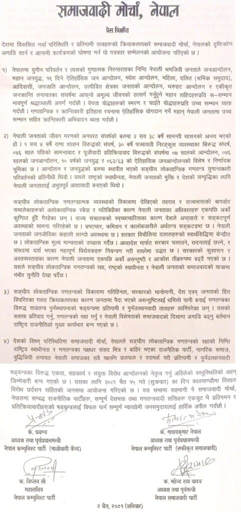 उक्त पत्रकार सम्मेलनमा नेपाल कम्युनिष्ट पार्टी ,नेकपा माओवादी केन्द्र , नेकपा (एकीकृत समाजवादी) र नेपाल समाजवादीका शिर्षथ नेताको संयुक्त हस्ताक्षरमा जारी गरिएको बिज्ञप्ति यस प्रकार रहेको छ – ‘देशमा विकसित नयाँ परिस्थिति र प्रतिगामी तत्वहरुको क्रियाकलापबारे समाजवादी मोर्चा, नेपालको दृष्टिकोण अगाडि सार्न र आगामी कार्यक्रमको घोषणा गर्न यो पत्रकार सम्मेलनको आयोजना गरिएको छ ।