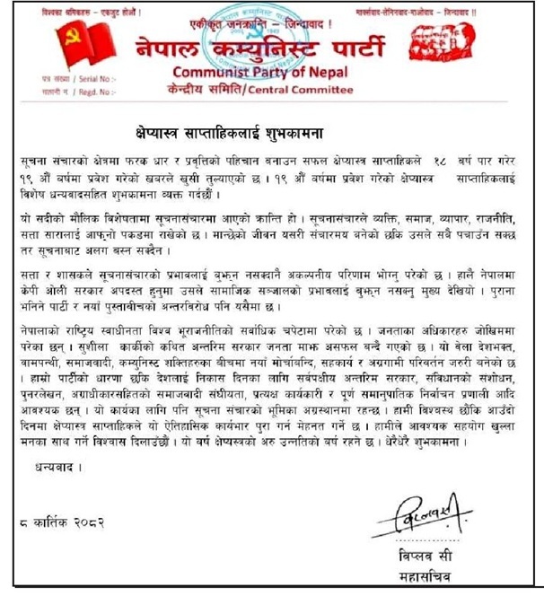 महासचिव विप्लव सीले उक्त शुभकामना सन्देशमार्फत भनेका छन – ‘यो सदीको मौलिक विशेषतामा सूचनासंचारमा आएको क्रान्ति हो । सूचनासंचारले व्यक्ति, समाज, व्यापार, राजनीति, सत्ता सारालाई आफ्नो पकडमा राखेको छ । मान्छेको जीवन यसरी संचारमय बनेको छकि उसले सबै पचाउँन सक्छ तर सूचनाबाट अलग बस्न सक्दैन ।