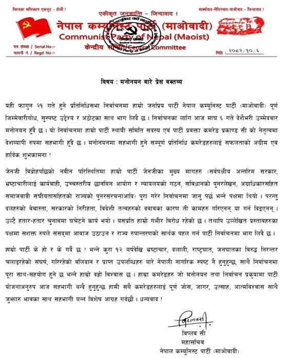 यस बिषयमा नेपाल कम्युनिस्ट पार्टी (माओवादी)का महासचिव विप्लव सीद्वारा जारी बिज्ञप्ति यस प्रकार रहेको छ – ‘यही फागुन २१ गते हुने प्रतिनिधिसभा निर्वाचनमा हाम्रो जनप्रिय पार्टी नेपाल कम्युनिस्ट पार्टी (माओवादी) पूर्ण जिम्मेवारीवोध, सुस्पष्ट उद्देश्य र अठोटका साथ भाग लिदै छ। निर्वाचनका लागि आज माघ ६ गते देशैभरी उम्मेदवार मनोनयन हुँदै छ। यो निर्वाचनमा हाम्रो पार्टी स्थायी समिति सदस्य एवं पार्टी प्रवक्ता कमरेड प्रकाण्ड सी को नेतृत्वमा देशव्यापी रुपमा सहभागी हुँदै छ। मनोनयनमा सहभागी हुने सम्पूर्ण प्रतिनिधि कमरेडहरुलाई सफलताको अग्रीम एवं हार्दिक शुभकामना !