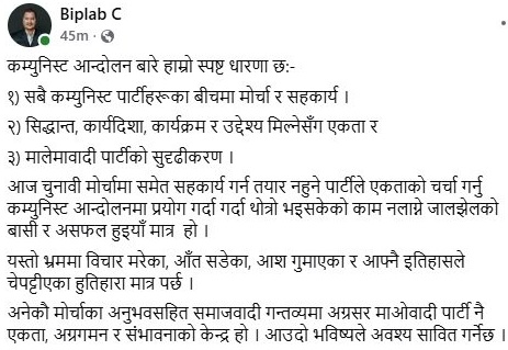 यस बिषयमा नेपाल कम्युनिष्ट पार्टी (माओवादी) का महासचिव विप्लव सीले फेसबुकमा लेखेको धारणा यस प्रकार रहेको छ – ‘कम्युनिस्ट आन्दोलन बारे हाम्रो स्पष्ट धारणा छ – सबै कम्युनिस्ट पार्टीहरूको बीचमा मोर्चा र सहकार्य, सिद्धान्त, कार्यदशा, कार्यक्रम र उद्देश्य मिल्नेसँग एकता र मालेमावादी पार्टीको सुदृढीकरण।