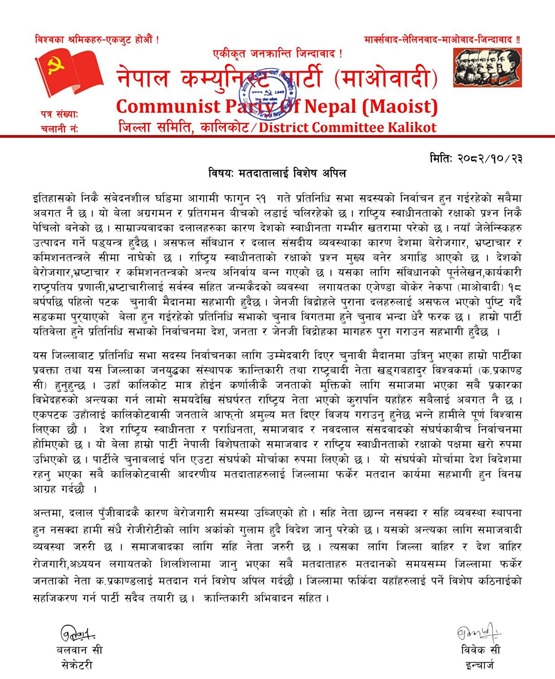 प्रकाण्डद्वारा श्रमजीवी जनताको प्रतिनिधित्व गर्ने पार्टी र नेतालाई जिताउन अपिल
