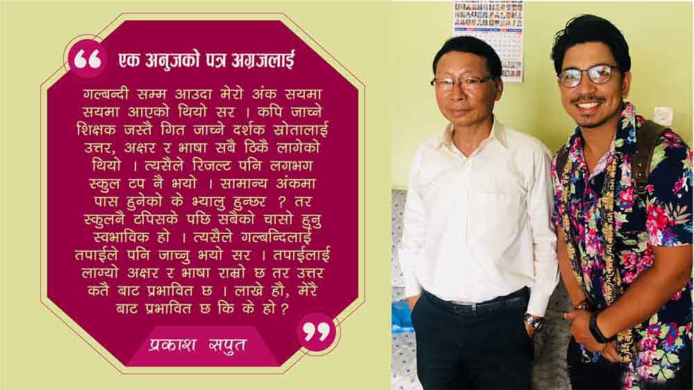 गल्बन्दी सम्म आउदा मेरो अंक सयमा सयमा आएको थियो सर । कपि जाच्ने शिक्षक जस्तै गित जाच्ने दर्शक स्रोतालाई उत्तर, अक्षर र भाषा सबै ठिकै लागेको थियो । त्यसैले रिज़ल्ट पनि लगभग स्कुल टप नै भयो । सामान्य अंकमा पास हुनेको के भ्यालु हुन्छर ? तर स्कुलनै टपिसके पछि सबैको चासो हुनु स्वभाविक हो । त्यसैले गल्बन्दिलाई तपाईले पनि जाच्नु भयो सर । तपाईलाई लाग्यो अक्षर र भाषा राम्रो छ तर उत्तर कतै बाट प्रभावित छ । लाखे हौ, मेरै बाट प्रभावित छ कि के हो ?