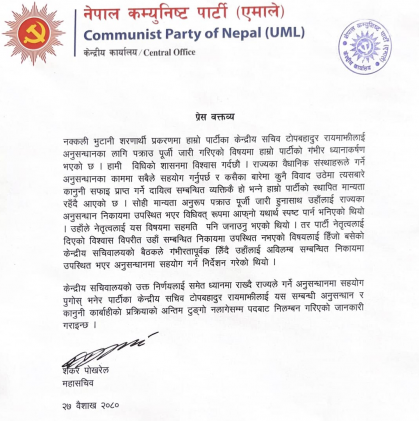 काठमाडौं । नेकपा एमालेले सचिव टोपबहादुर रायमाझीलाई पार्टीबाट निलम्बन गरेको छ । महासचिव शंकर पोखरेलद्वारा जारी विज्ञप्तिमा नक्कली भुटानी शरणार्थी प्रकरणमा मुछिएर फरार रहेका रायमाझीलाई अनुसन्धान र कारबाहीको टुंगो नलागुन्जेल एमालेले निलम्बन गरेको जानेको छ । विज्ञप्तिमा भनिएको छ, ‘केन्द्रीय सचिवालयको निर्णयलाई समेत ध्यानमा राख्दै राज्यले गर्ने अनुसन्धानमा सहयोग पुगोस् भनेर पार्टीका केन्द्रीय सचिव टोपबहादुर रायमाझीलाई यस सम्बन्धी अनुसन्धान र कानुनी कार्बाहीको प्रक्रियाको अन्तिम टुङ्गो नलागेसम्म पदबाट निलम्बन गरिएको जानकारी गराइन्छ ।’