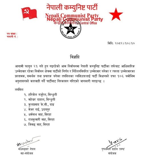 पार्टीद्वारा जारी विज्ञप्तिमा भनिएको छ – ‘आगामी फागुन २१ गते हुन गइरहेको आम निर्वाचनमा नेपाली कम्युनिस्ट पार्टीका तर्फबाट आधिकारिक उम्मेदवार रहेका निर्वाचन क्षेत्रमा पार्टीको निर्णय र निर्देशनविपरित उम्मेदवार बनेका र त्यस्ता उम्मेदवारका प्रस्तावक, समर्थक तथा प्रचारक बनेका तपसिलका व्यक्तिहरूलाई पार्टी विधानको दफा १०६ बमोजिम अनुशासनको कारबाही गर्दै पार्टीबाट निष्कासन गरिएको जानकारी गराइन्छ ।’