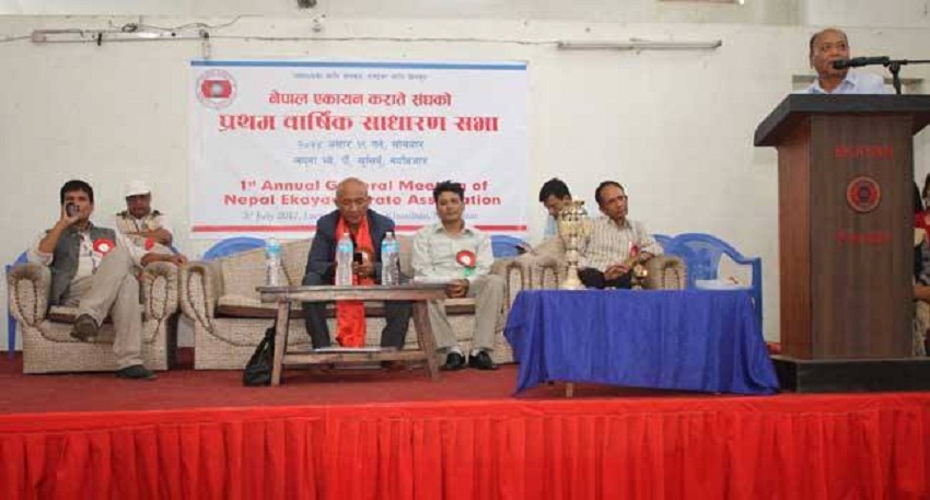काठमाडौँ, २० असार । नेपाल एकायन कराते संघले सोमबार प्रथम बार्षिक सभा सम्पन्न गरेको छ । राष्ट्र निर्माणका लागि स्वाथ्य जनशक्ति र स्वाथ्य जनशक्तिकालागि खेलकुद भन्ने मुलनाराका साथ काठमाडौँको खुसिबूमा आयोजित कार्येक्रममा प्रमुख अतिथिको रुपमा राट्रिय खेलकुद परिषदका उपाध्यक्ष लामा टेण्डी शेर्पा , अतिथिमा डा चन्द्र मन बज्राचार्य ,काठमाडौँ महानगर पालिका १७ वडाका वडा अधक्ष्य नविन मानन्धरले खेल कुदक्षेत्रको बृहत्तर बिकाशकालागि ,अन्तर राष्ट्रिय जगतमा राष्ट्रको पहिचान बढाउन सबै क्षेत्रका ब्येक्तित्त्वोको अनुकरणीय भूमिका रहनु पर्नेमा जोड दिनु पर्ने बताए । विभिन्न जिल्लाबाट समेत आमन्त्रित प्रतिनिधिहरु ,सामाजिक क्षेत्रका प्रतिनिधिहरु बीचबाट १७ सत्र सदस्य समिति निर्बिरोध चयेन गरिएको छ । जस अनुसार अध्यक्षमा श्री कृष्ण डंगोल ,उपाध्यक्षमा श्याम कृष्ण श्रेष्ठ अर्का उपध्यक्षमा खिल बहादुर खनाल ,महासचिबमा संजय मुल्मी , सचिवमा बुद्ध शरण शाही ,कोषाध्येक्षमा रिता श्रेष्ठ र सदस्यहरुमा क्रमस धर्मेन्द्र महर्जन ,मिना प्रजापति ,कृष्ण गोपाल शाही ,बिरेन्द्र कुमार श्रेष्ठ ,प्रचीन श्रेष्ठ ,राजेन्द्र शाक्य ,भगत बहादुर ब्लोन ,युवराज तामांग ,वासुदेव खत्री ,पूर्ण लक्ष्मी शाक्य रहेको छ । बि स २०७२ मा स्थापित एकायन कराते संघका अधिराज्य भरिमा नुवाकोट , काब्रे , मकवानपुर ,धादिंग, चितवन ,बाँके , भक्तपुर ,ललितपुर ,पर्सा ,कास्की ,कैलाली,ओखल्धुङ्गा ,सोलुखुम्बु ,महत्तरी लगाएत जिल्लाहरुमा शाखा समेत रही विभिन्न राष्ट्रिय स्तरका खेल प्रतियोगिता समेत आयोजना गर्दै आएको छ ।