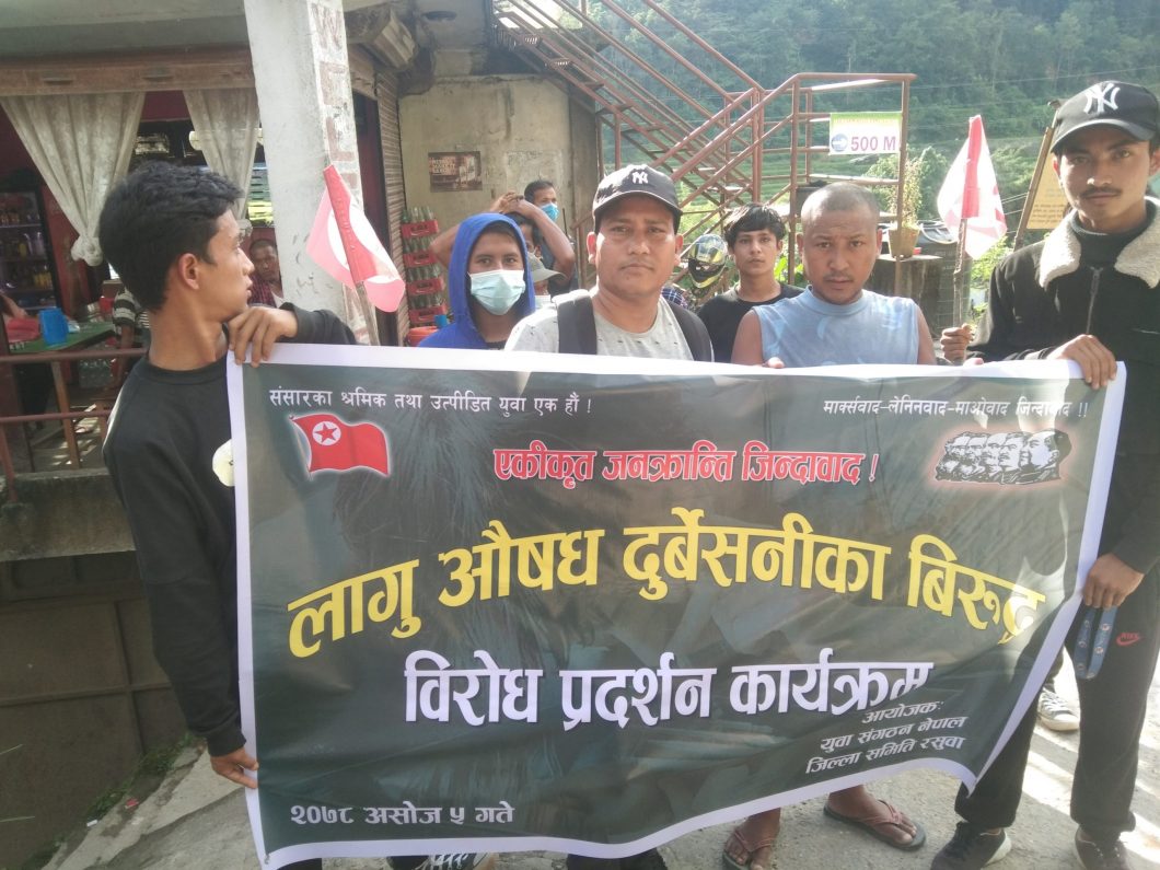 यसैगरी , युवा संगठन नेपाल रसुवाले लागू औसध दुर्व्यसनविरुद्ध विरोध प्रदर्शन कार्यक्रम रसुवाको बेत्रावतीमा सम्पन्न गरेको छ । नारा जूलूससहित रसुवाको बेत्रावती बजार परिक्रमा गरि धुन्चे मैलुङ दोबाटो चोकमा कोण सभाको आयोजना समेत गरेको थियो । नेकपा रसुवाका सेक्रेटरी बिराजले उक्त कोणसभालाई सम्बोधन गर्दै राज्यले युवा शक्तिलाई वेवास्ता गरेको र बेरोजगारीको तनावले गरिबी र पीडाका कारण युवाहरू बरालिन बाध्य भएको बताए । देशमा यो दलाल संसदिय व्यवस्था रहेसम्म युवाहरूको हालत झन खराब हुँदै जाने हुँदा आम युवाहरू क्रान्तिमा लामबद्द हुन र वैज्ञानिक समाजवादी व्यवस्था ल्याउनलाई संघर्ष गर्नुपर्ने आवश्यकता औंल्याए । चीन युरोप र अमेरिकका युवाहरूले आज विज्ञान र प्राविधिमा गरेको अभुतपूर्व विकासले संसारलाई अगाडि बढाइरहेको तर हाम्रो देशको दलाल शासकहरुको कारण युवाहरू लागू औषधको कुलतमा फस्न थालेकाले सबै युवा अब सचेत हुनुपर्ने बताए ।