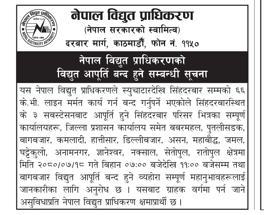 सिंहदरबारभित्र र आसपासका क्षेत्रमा शनिबार विद्युत आपूर्ति बन्द हुने