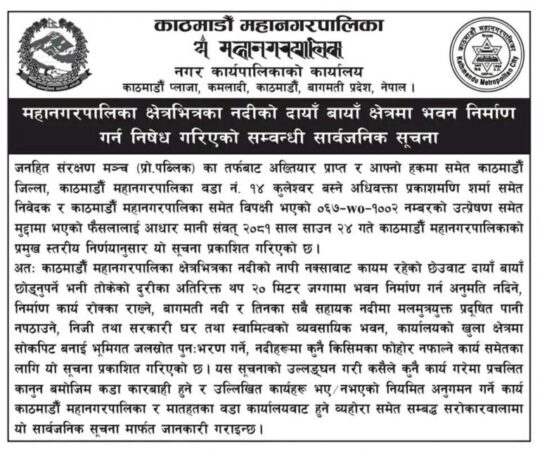 काठमाडौँ । काठमाडौं महानगरपालिकाभित्रका नदीको दायाँबायाँ २० मिटरसम्म भवन निर्माण गर्न नपाइने भएको छ । महानगरपालिकाले सार्वजनिक सूचना निकालेर महानगरभित्रका नदीको दायाँरबायाँ क्षेत्रमा भवन निर्माण गर्न निषेध गरेको हो ।
