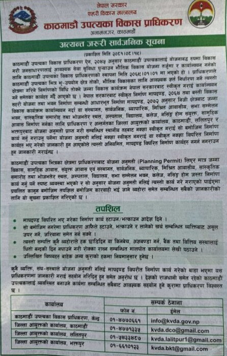 काठमाडौँ । काठमाडौं उपत्यका विकास प्राधिकरणले आज एक सूचना जारी गर्दै नेपाल सरकारबाट स्वीकृत निर्माण मापदण्ड विपरीत कुनै किसिमको भौतिक संरचना नबनाउन आग्रह गरेको छ । प्राधिकरणले काठमाडौं उपत्यका भित्रका क्षेत्रमा सम्बन्धित स्थानीय तहबाट नक्सा स्वीकृत गराई योजना अनुमति लिएर मात्र जग्गा विकास, सामूहिक आवास, संयुक्त आवास एवं संस्थागत, सार्वजनिक, व्यापारिक, भोजभतेर स्थल, अस्पताल, विद्यालय, नर्सिङ होमलगायत संरचना निर्माण थाल्न सुझाएको हो । मापदण्ड विपरीत अनुमति नलिई कुनै पनि संरचना निर्माण गरिएको पाइए कारबाही हुने प्राधिकरणले चेतावनी दिएको छ ।