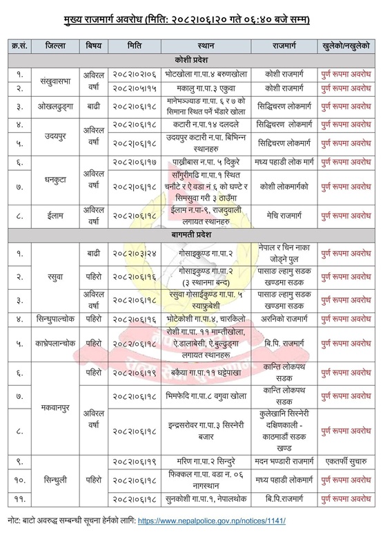 भीषण वर्षाका कारण अवरूद्ध राजमार्ग (सूचीसहित )