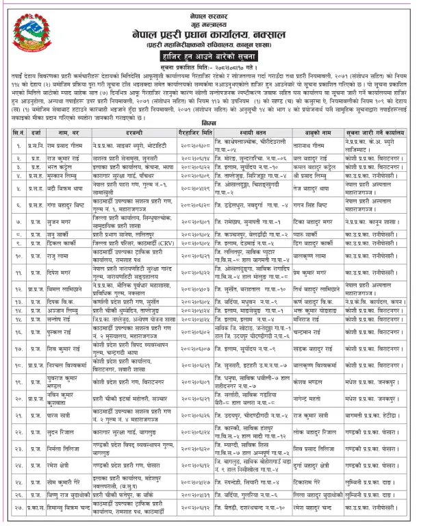 प्रधान कार्यालयले आज एक सार्वजनिक सूचनामार्फत गैरहाजिर प्रहरी सहायक निरिक्षक, प्रहरी जवान र प्रहरी कार्यालय सहयोगीको नाम, ठेगाना, गैरहाजिर भएको मिति लगायतको विवरण सार्वजनिक गर्दै बाटोको म्याद बाहेक सात दिनभित्र हाजिर हुन निर्देशन दिएको हो ।